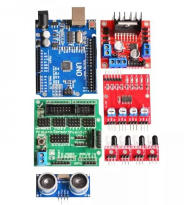 This kit provides a mini server and 4 gear motors. It also includes an L298N motor driver and UNO328 controller board. Four 65mm wheels and fixing devices make the kit more complete.