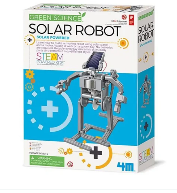 • The 4M Green Science Solar Robot Kit provides an engaging way to understand the application of solar panels and motors by building mobile robots. This environmentally friendly robot runs on solar energy only and does not require any battery.
