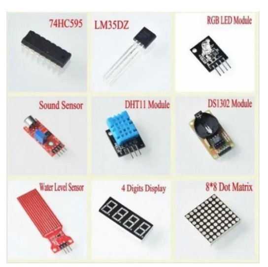 • It also integrates a sound detection module, a temperature and humidity module, and a water level detection module to enable users to engage in environmental monitoring projects. In addition, the kit includes a 4x4 keypad module and an 8x8 dot matrix module for input and display. This comprehensive kit is ideal for beginners and hobbyists who want to gain hands-on experience in electronics and programming.