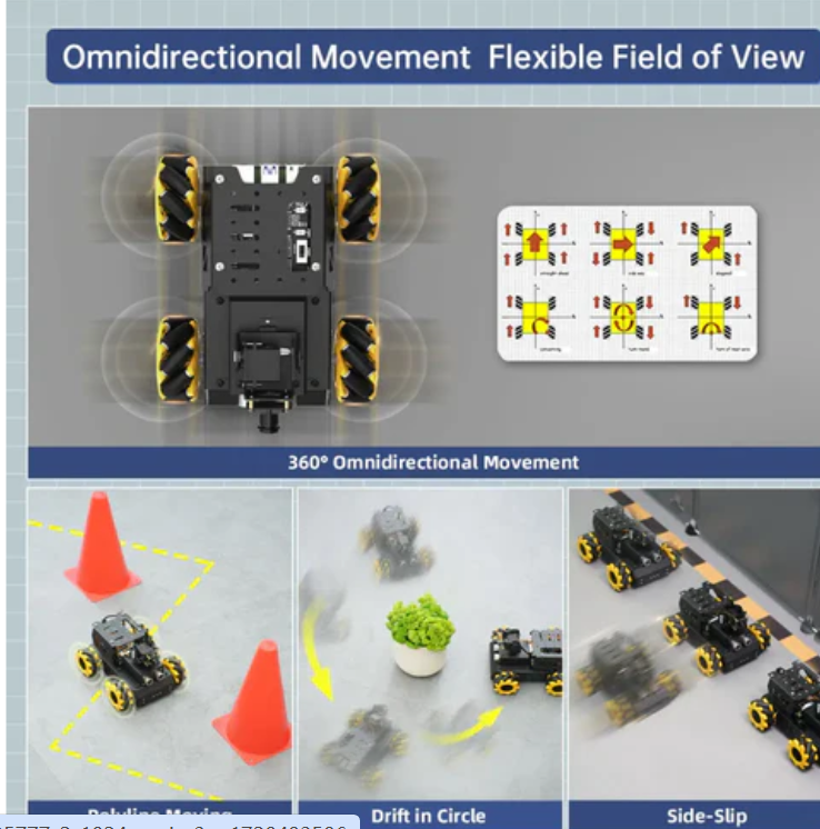 The TurboPi is equipped with four universal Mecanum wheels, which can rotate 360 °. It has multiple motion modes (forward, horizontal, diagonal, and rotary) and excellent performance, allowing it to challenge various complex routes.