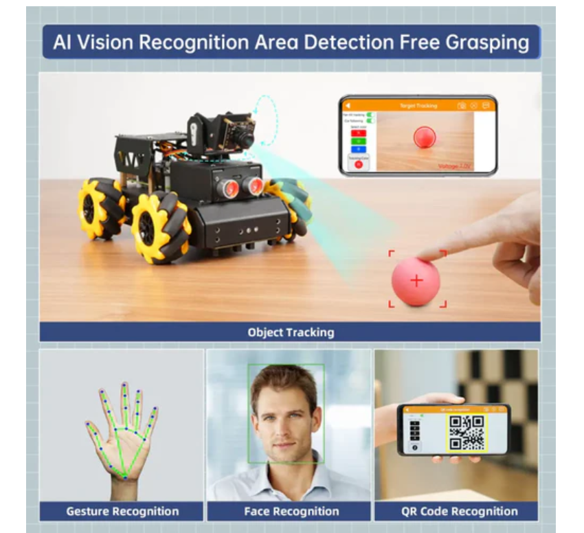 TurboPi uses OpenCV as an image processing library to recognize target objects and complete AI games such as face tracking, color tracking, QR code recognition, gesture recognition, object recognition, and line tracking.