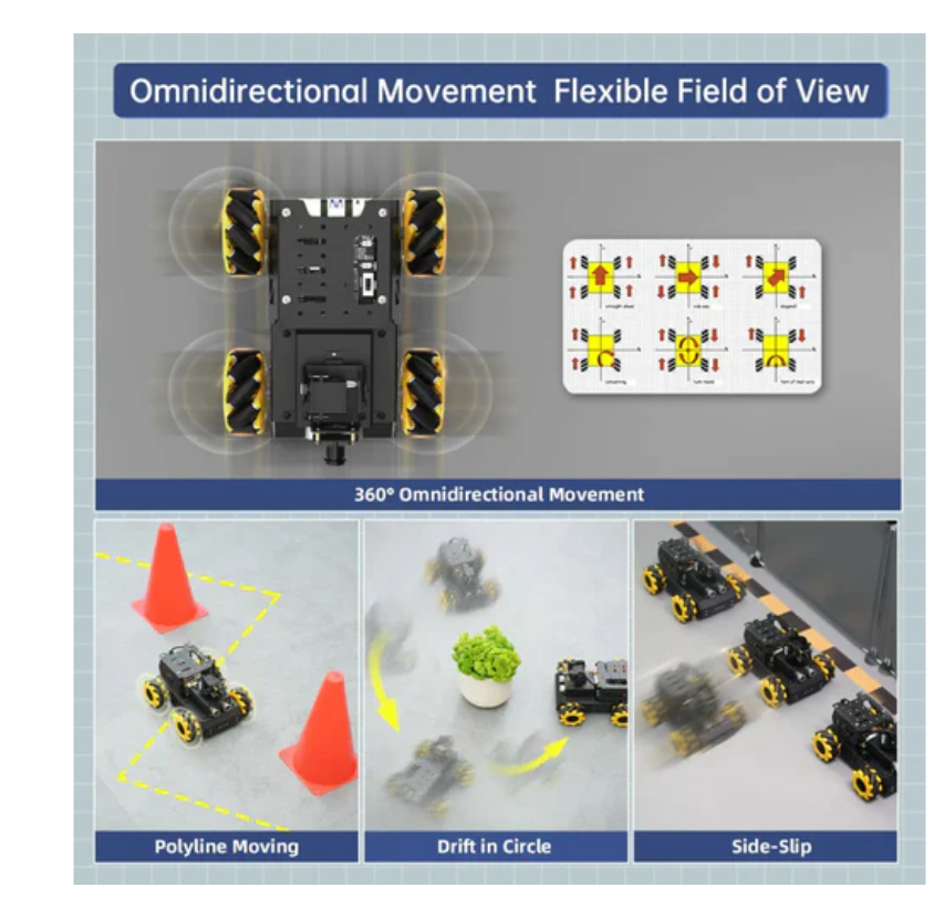 The TurboPi is equipped with four universal Mecanum wheels, which can rotate 360 °. It has multiple motion modes (forward, horizontal, diagonal, and rotary) and excellent performance, allowing it to challenge various complex routes.