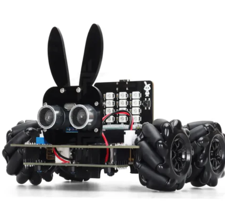 This kit supports multiple functions, including 360 degree omnidirectional movement, ultrasonic obstacle avoidance, and RGB lighting. It is compatible with Android smartphone applications and allows for BLE wireless control. The design of the robot includes a charming rabbit shaped ultrasonic bracket, adding fun to the learning experience.