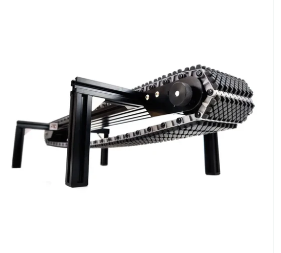 • The frame of the conveyor is made of aluminum extruded parts and composite G10 board. The friction top (rubber pattern) modular track segment helps ensure that the product stays on the conveyor, while the drive and idler sprockets always maintain track alignment.