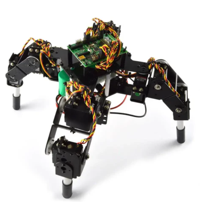 SQ3 is a quadruped robot with 3 degrees of freedom per leg and a symmetrical body design. The symmetry of the robot makes it a very unique quadruped walking robot. The three degree of freedom leg design provides the flexibility needed to walk in any direction and roll the body! The robot uses eight HS-645MG servers and four HS-422 servers. The SES kit includes everything needed to make functional robots.