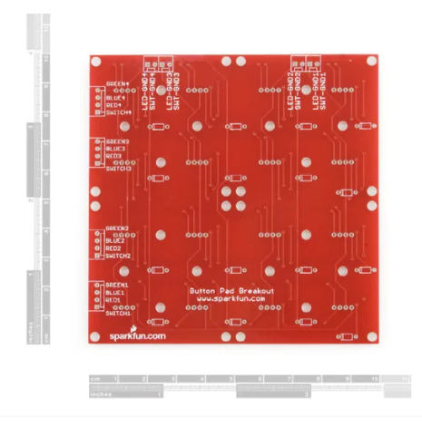 The Sparkfun Button Pad 4x4 - Breakout PCB is a simple breakout board designed for a 4x4 silicone button pad. Each LED and button is accessible via side connectors, which are soldered on the back of the PCB. The board now includes footprints for the diodes (specifically the 1N4148 through-hole diode) to facilitate easier isolation and decoding of switches.