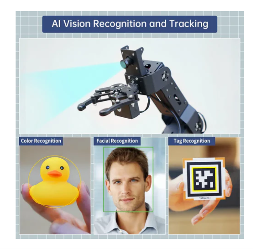 Loading a 5DOF artificial intelligence visual robotic arm to achieve precise positioning, tracking, picking, classification, and stacking of target objects