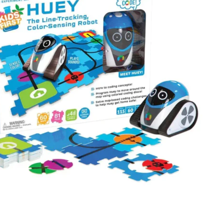 Thames & Kosmos Huey: This color sensitive robot with trackable lines allows children to experience the world of robots and coding without the need for a screen. Huey is equipped with a built-in color sensor that allows navigation on maps created using 81 puzzle shaped blocks.