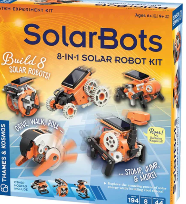 Thames & Kosmos Solarbots: The 8-in-1 solar robot kit can build unique solar robots. These innovative inventions utilize compact solar panels to harness solar energy, providing power for electric motors and promoting movement. This kit can be used to create various robots, including drummer robots that move while drumming, armadillo robots that can somersault, and crawling hexapod solar powered insects.