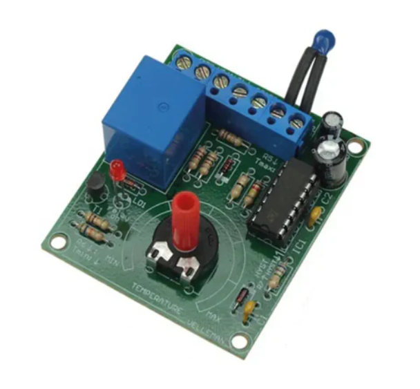 • The Velleman thermostat soldering kit is a versatile, low-cost thermostat with an NTC temperature sensor. It has an output relay with an LED indicator. The kit comes with a 12V DC/100mA power supply.