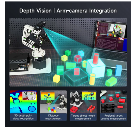 • Combined with a high-performance 3D depth camera, DOFBOT-PRO can not only realize environmental perception, object recognition and other functions, but also perform accurate three-dimensional spatial positioning according to the target RGB data, position coordinates and depth information, and combine RGB+D fusion detection to complete complex visual recognition and grasping tasks.
