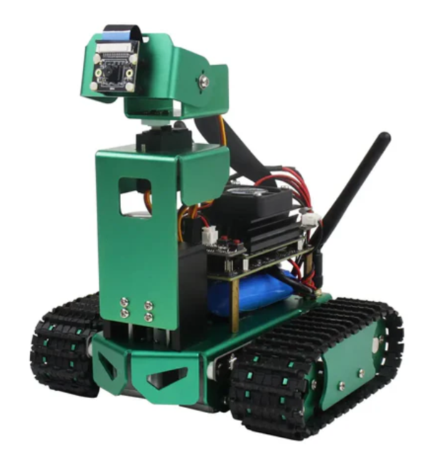 • Yahboom Jetbot Standard Edition AI robot with high-definition camera, suitable for Jetson Nano 4GB (without Jetson Nano board) is a multifunctional AI intelligent robot car based on Jetson Nano 4GB (A02/B01/SUB), which can quickly respond to various visual games. The car is made of green aluminum alloy, coupled with a unique mechanical structure, making its appearance unique compared to other cars. It is equipped with a 3-degree-of-freedom lifting platform and an 8-megapixel high-definition camera, which can view the surrounding environment in real time. It can also be used for automatic obstacle avoidance, object tracking, color recognition/tracking, detecting desktop edges to prevent falls, and more. You can also train various runway models and use Jetbot to complete autonomous driving functions. Programmable RGB light strips are also designed on both sides to provide bright and colorful lighting in dark environments. Users can remotely control it through an application or controller, and we will provide a large number of reference tutorials for users.