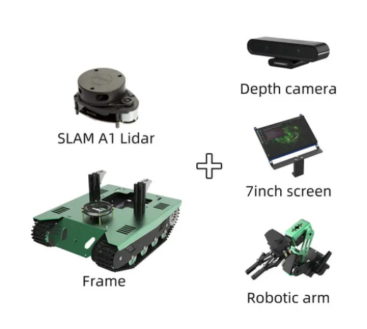 The whole vehicle is made of green aluminum alloy oxidation material, and supports the installation of robotic arms, 2DOF camera gimbals, 7-inch screens, etc.