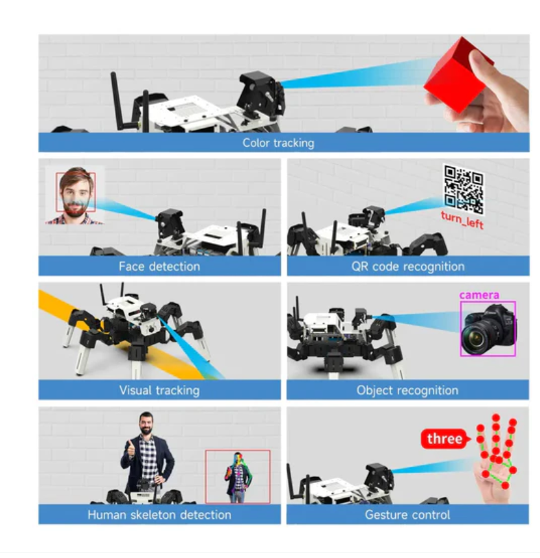 • The 18DOF hexapod robot is made of all metal aluminum alloy, sturdy and durable, and can move stably and flexibly in various environments.