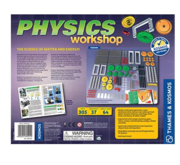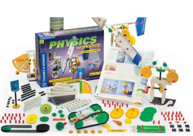 Give the Thames and Cosmos physics workshops to children, allowing them to experience simple mechanical experiments such as gears, levers, pulleys, screws, and wheels. This educational kit enables children to learn the basics of physics equations. It has 300 building blocks and can make models of 36 types of operating machines and moving vehicles.