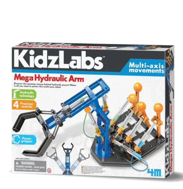 The 4M KidzLabs giant hydraulic arm kit allows children to explore the fascinating principles of hydraulic power. This multi axis robot runs entirely on water, providing a unique and fun learning experience.
