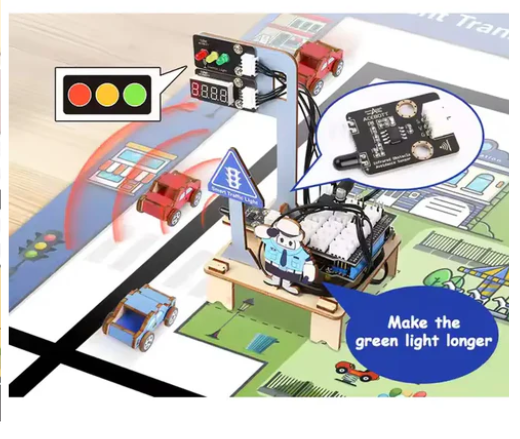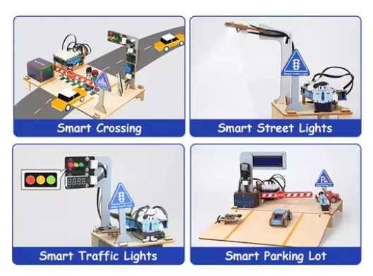 • The kit is centered around the ESP32 controller board and is compatible with the Arduino and Scratch programming platforms. It includes a variety of projects such as smart intersections, smart street lights, smart traffic lights, and smart parking lots, designed to enhance children's logical thinking, introduce them to basic programming concepts, and develop their problem-solving skills. The educational content is supported by comprehensive tutorials and instructional guides, ensuring a step-by-step learning process.