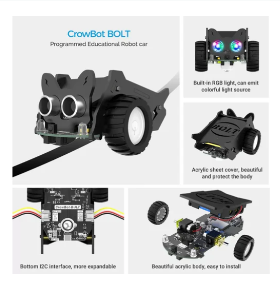 CrowBot BOLT can quickly perform a range of functions, including ray tracing, line tracing, obstacle avoidance, remote control, and light shows. As a STEAM educational robot suitable for beginners, BOLT aims to make the process of learning and teaching robot programming simple and fun.