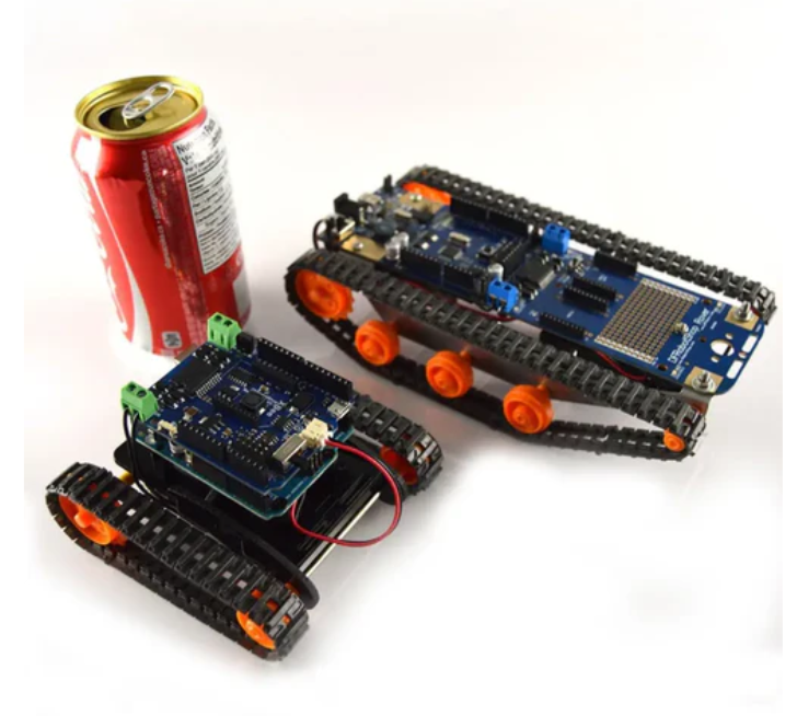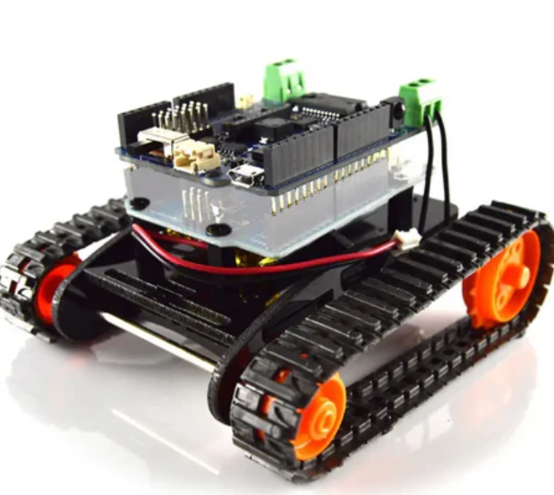 The Mini DFRobotShop Rover development platform (without Arduino) is a small, inexpensive tracked platform that provides you with the basic tools needed to experiment with Arduino based programming and mobile robots. It is necessary to purchase a microcontroller based on Arduino (such as Arduino Uno) that is compatible with shielding separately. The frame is made of durable laser cut Lexan parts, and the drive system consists of a Tamiya dual motor gearbox (must be assembled according to configuration A) and Tamiya track and wheel sets.