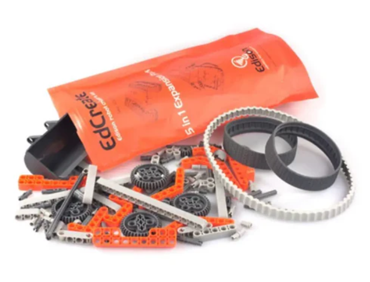 The EdCreate Edison Robot Creator Kit is a 5-in-1 expansion pack construction system designed to work with the Edison robot. Each kit contains 115 interlocking bricks, pegs, gears and other parts.