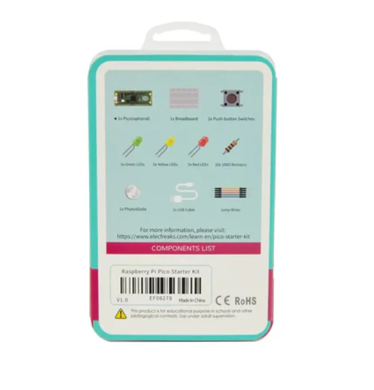 • The ELECFREAKS Raspberry Pi Pico Starter Kit (Raspberry Pi Pico board not included) is an electronics starter kit designed for Raspberry Pi. The kit contains basic electronic components such as light emitting diodes (LEDs), buttons, photodiodes, etc., allowing you to easily step into the fascinating world of electronics. Also includes a breadboard, push button switches, green/yellow/red LEDs, resistors, photodiodes, USB cables, and various jumper wires.
