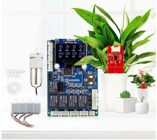 • Elecrow Arduino Automatic Smart Plant Watering Kit 2.1 (US Plug) is a state-of-the-art system that automatically waters your plants. Built on Arduino Leonardo, the kit includes a built-in real-time clock (RTC) for scheduling water supply. In addition, it also comes with a 0.96-inch OLED display to show time and soil moisture status.