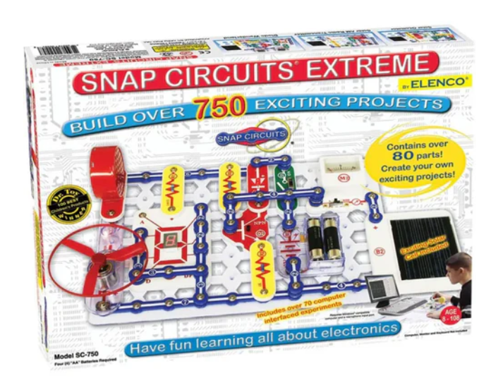 • The Elenco Snap Circuits Extreme 750-in-1 Kit includes everything in the Snap Circuits Pro 500-in-1 Experiment Kit, plus solar energy, electromagnetism, vibration switch experiments, and 70 computer interface experiments.