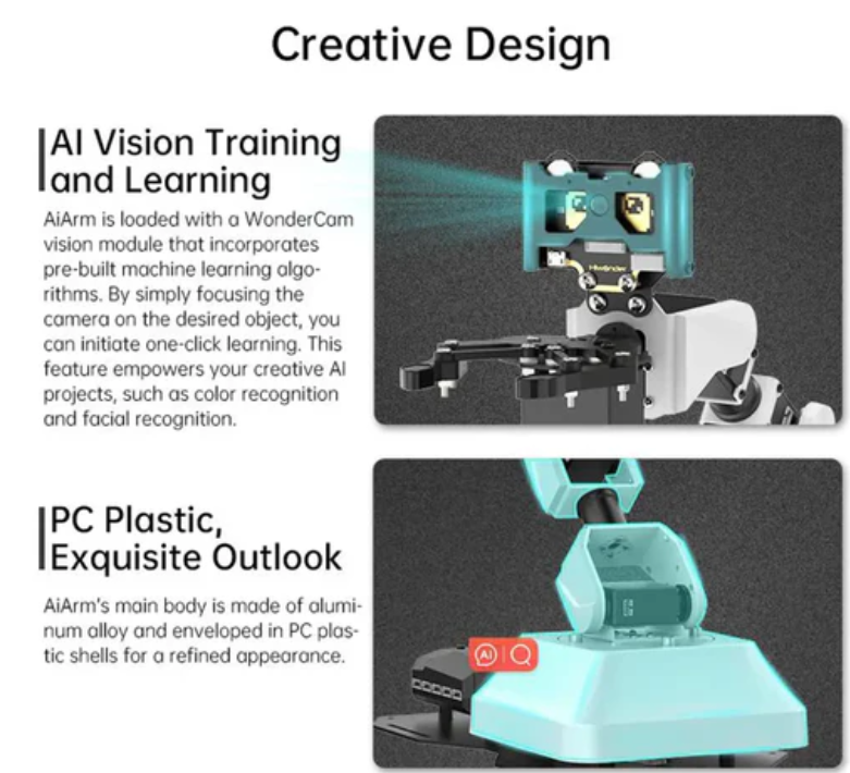 1) The AI vision training AiArm is equipped with WonderCam vision module, which integrates pre-set machine learning algorithms. Simply aim the camera at the target object and start learning with just one click. This feature can help you achieve creative artificial intelligence projects such as color recognition and facial recognition.