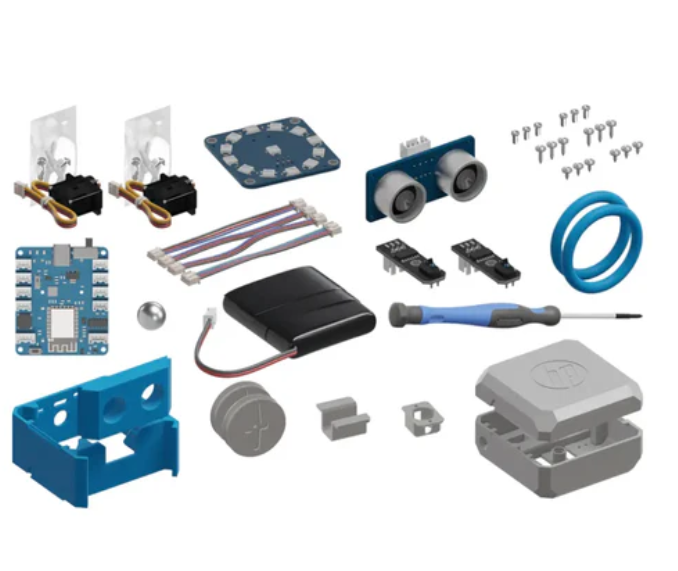 The HP Robot Otto entry-level assembly kit provides all the components needed to assemble a fully functional robot. This comprehensive kit includes electronic and 3D printed plastic components, making it an ideal educational tool for children aged 8 and above. Otto guides students through the process of designing, 3D printing, assembling, and programming their first robot. The assembly process is simple and does not require welding.