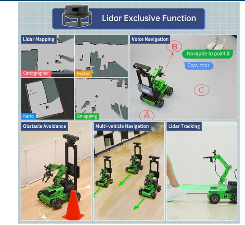JetAuto Pro can achieve multi machine formation performances and artificial intelligence games through multi machine communication and navigation technology.