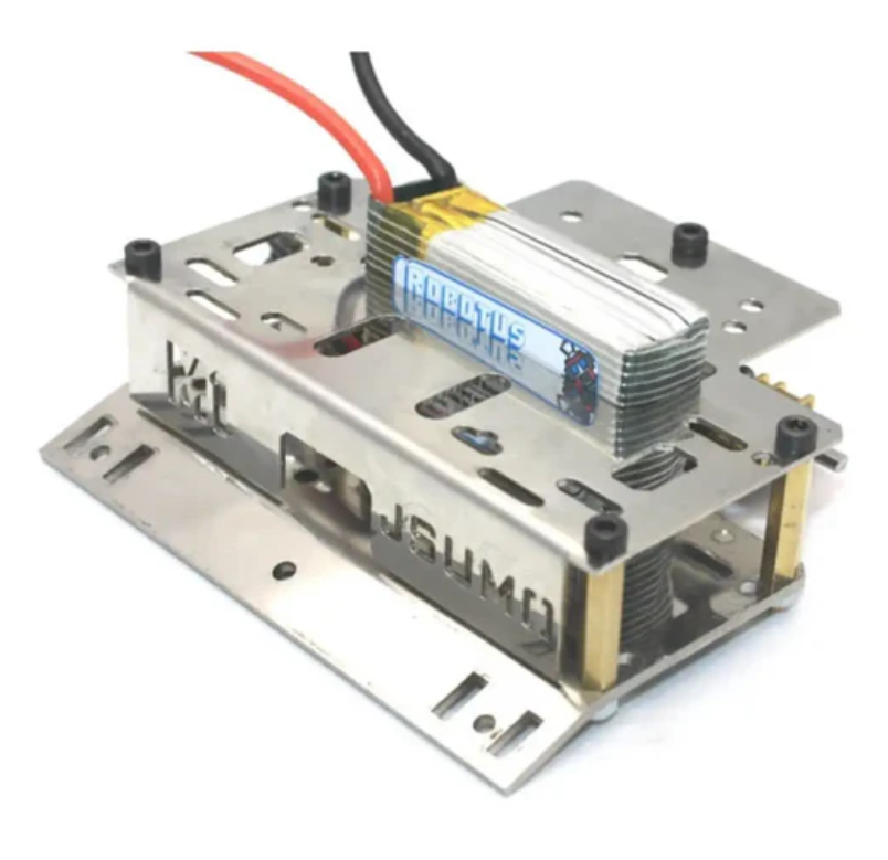 In addition, there is a gap in the center of the upper plate for connecting lithium batteries. You can place 3S or 2S 350, 400, or 500 mAh batteries inside. It supports many different robot boards with numerous holes and slots. All slots are cut to a width of 3.3 millimeters. It is very easy to connect your circuit board using standard M3 size screws.