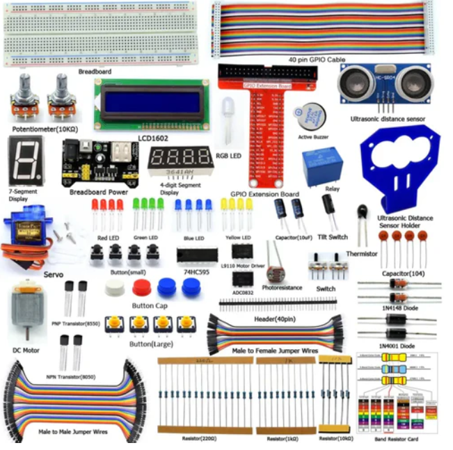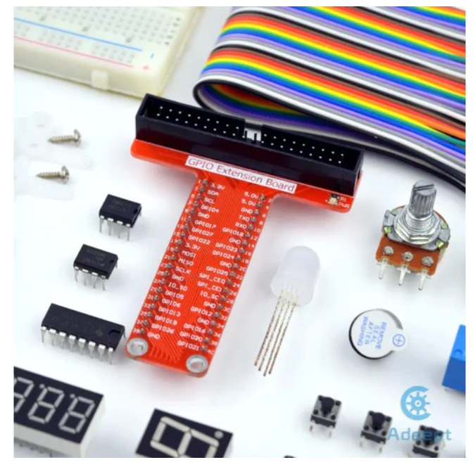 The Adeept Ultrasonic Distance Sensor Raspberry Pi Starter Kit is a set of over 150 Raspberry Pi components and electronic modules. The parts can be divided into about 25 types.