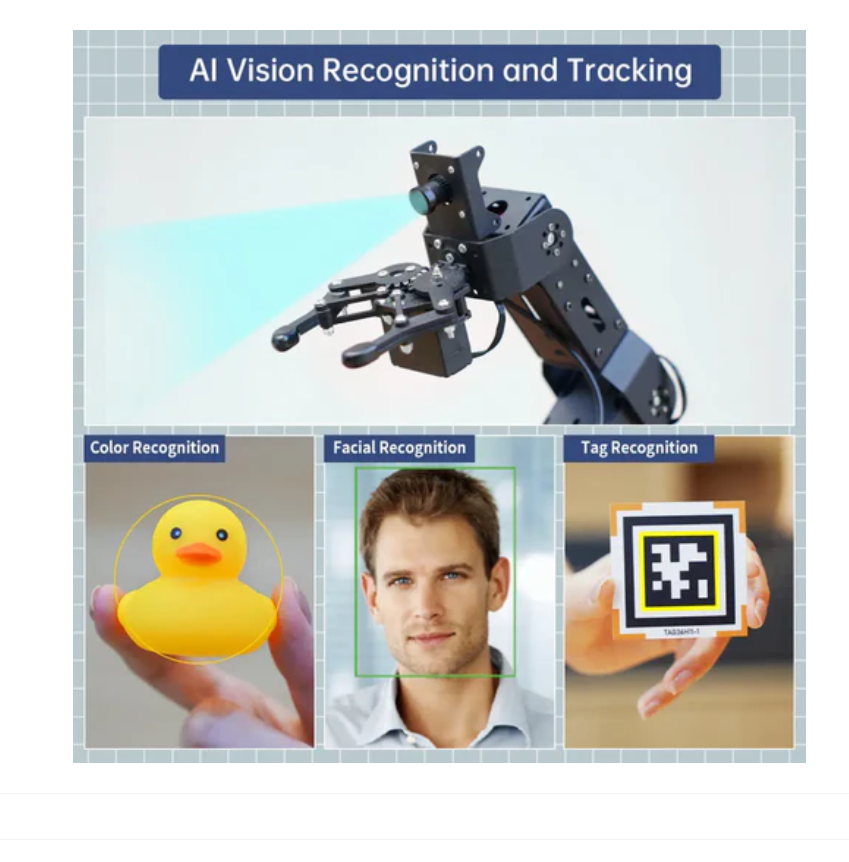 • Loading a 5DOF artificial intelligence visual robotic arm to achieve precise positioning, tracking, picking, classification, and stacking of target objects