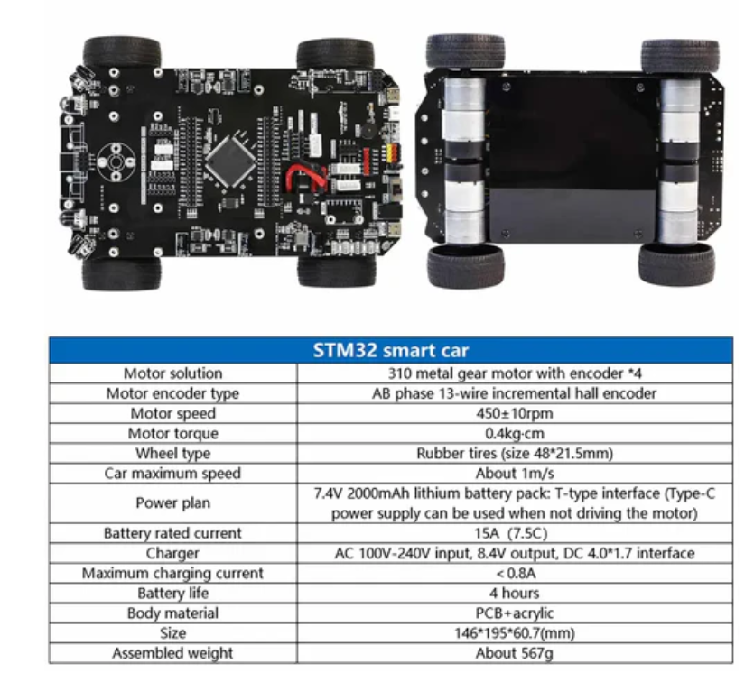 There are multiple configurations to choose from for smart cars, including high-capacity lithium batteries, 310 motors with encoders, OLED displays, and infrared controllers.