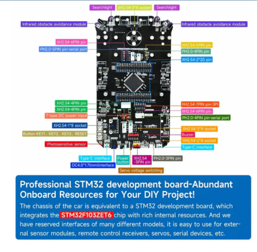 This development board is designed based on STM32 MCU and integrates various components and sensors. With STM32F103ZET67 as the core chip, it gathers multiple components such as buzzer, infrared sensor, photosensitive sensor, RGB searchlight, independent button, etc., combined with tires, motors, ultrasonic modules, etc., it can be assembled into a 4WD intelligent car. Through C language programming, it can achieve various functions such as autonomous obstacle avoidance, infrared tracking, remote control, etc. We have also designed rich interfaces (XH2.5, PH2.0, UART, SPI, etc.) on the STM32 board, providing developers with the possibility of custom extensions and feature enhancements, making it an ideal platform for learning embedded system development and robot cars.