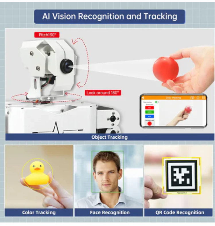 TonyPi is equipped with a wide-angle high-definition camera on its head, which utilizes OpenCV's image processing capabilities to effectively identify and locate target objects.