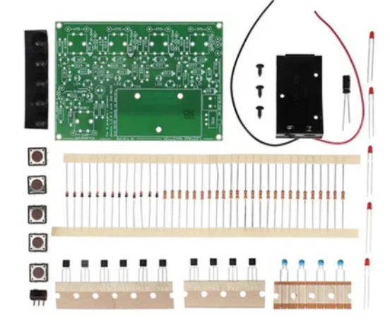 • The Velleman Quiz Table Kit has 4 buttons and 4 LEDs that indicate who is the first player to press a button. The quiz master can reset the quiz table by pressing a fifth button, which also displays "Button Pressed".