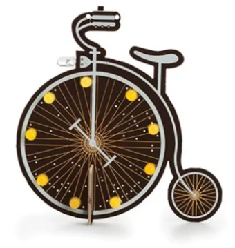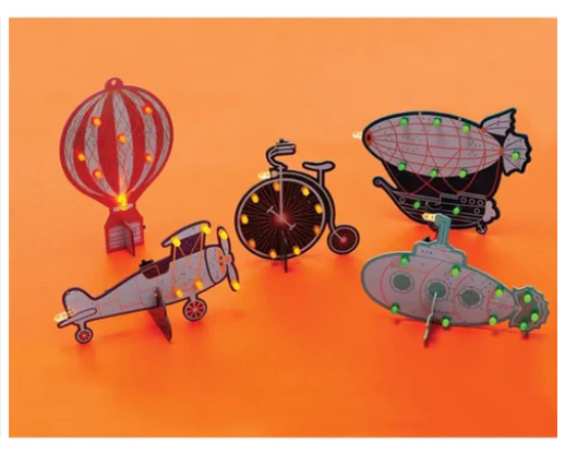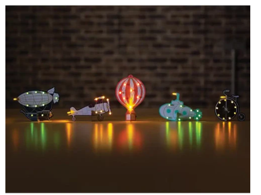 • The second kit is designed in the shape of a Jules Verne-style bicycle and can also be hung using the small mounting holes on the top or stand alone. It features a unique brown print and comes with multiple yellow LED lights, and a warm candle-flashing LED light on the top.