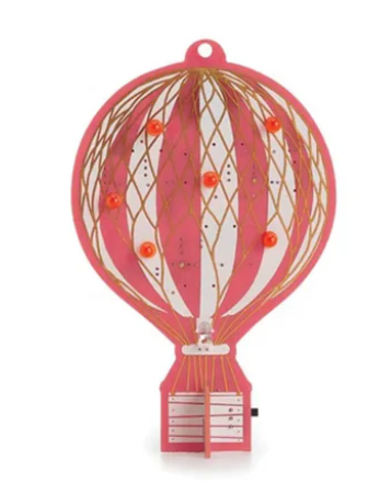 • The first kit is designed in the shape of a Jules Verne hot air balloon and can be hung using the small mounting holes on the top or stand alone. It features a unique orange-red print and comes with multiple orange LED lights, and a warm candle-flashing LED light in the center.