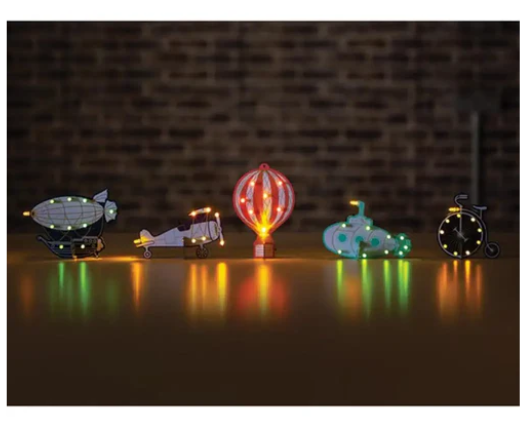 • This particular kit is shaped like a Jules Verne-style zeppelin, and can be hung from the small mounting holes on the top, or it can stand on its own.