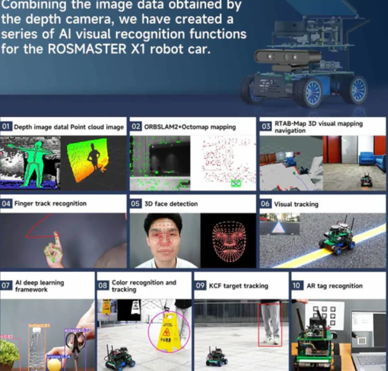 1. The multifunctional expansion board, combined with accessories such as radar, depth camera, and voice module, can achieve various interesting gameplay for robots. For example, technology intelligent games such as path planning, radar obstacle avoidance and tracking, 3D visual mapping and navigation, AI visual recognition and tracking, multi vehicle control, voice remote control, etc