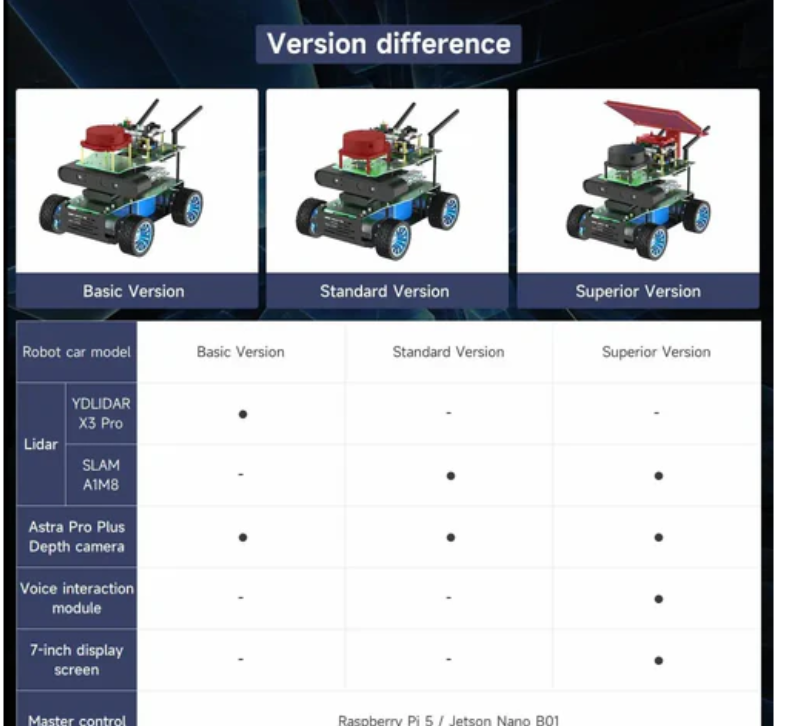 4. In order to meet the needs of users at different levels, Yahboom offers multiple version options. Please order the version with a main control board according to your actual situation (note: without a development board, the robot cannot work). For the selection of accessories, please refer to the detailed introduction